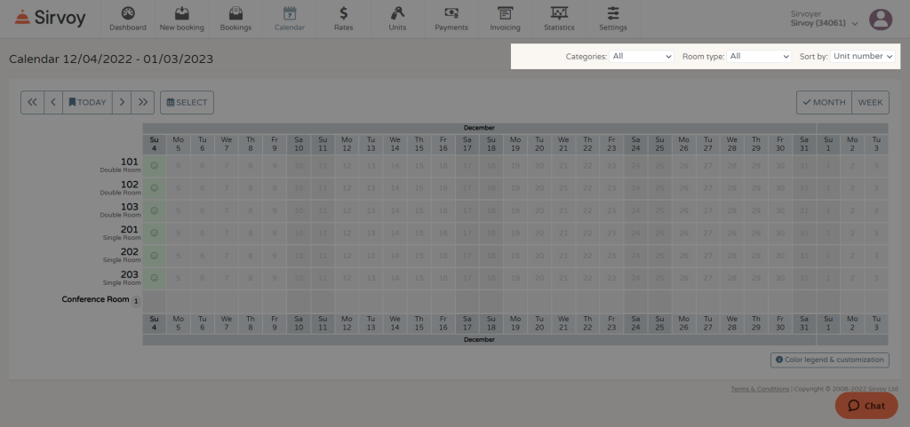 Du kannst die Kalenderseite filtern, um nur eine bestimmte Kategorie oder einen bestimmten Zimmertyp anzuzeigen.