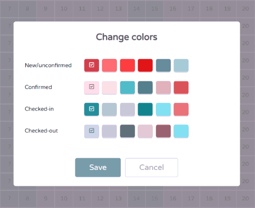 - Die Farbe der Buchungsleiste ändert sich je nach Status (Neu/Unbestätigt, Bestätigt, Eingecheckt und Ausgecheckt) und kann farblich angepasst werden.