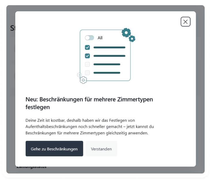 Das Verwalten von Beschränkungen war bisher recht klickintensiv. Jetzt kannst du mehrere Zimmertypen gleichzeitig auswählen und Beschränkungen in einem Schritt anwenden – statt jede Beschränkung einzeln einzurichten. Das ist eine schnellere und smartere Lösung für saisonale Regeln, Events oder andere Anforderungen.