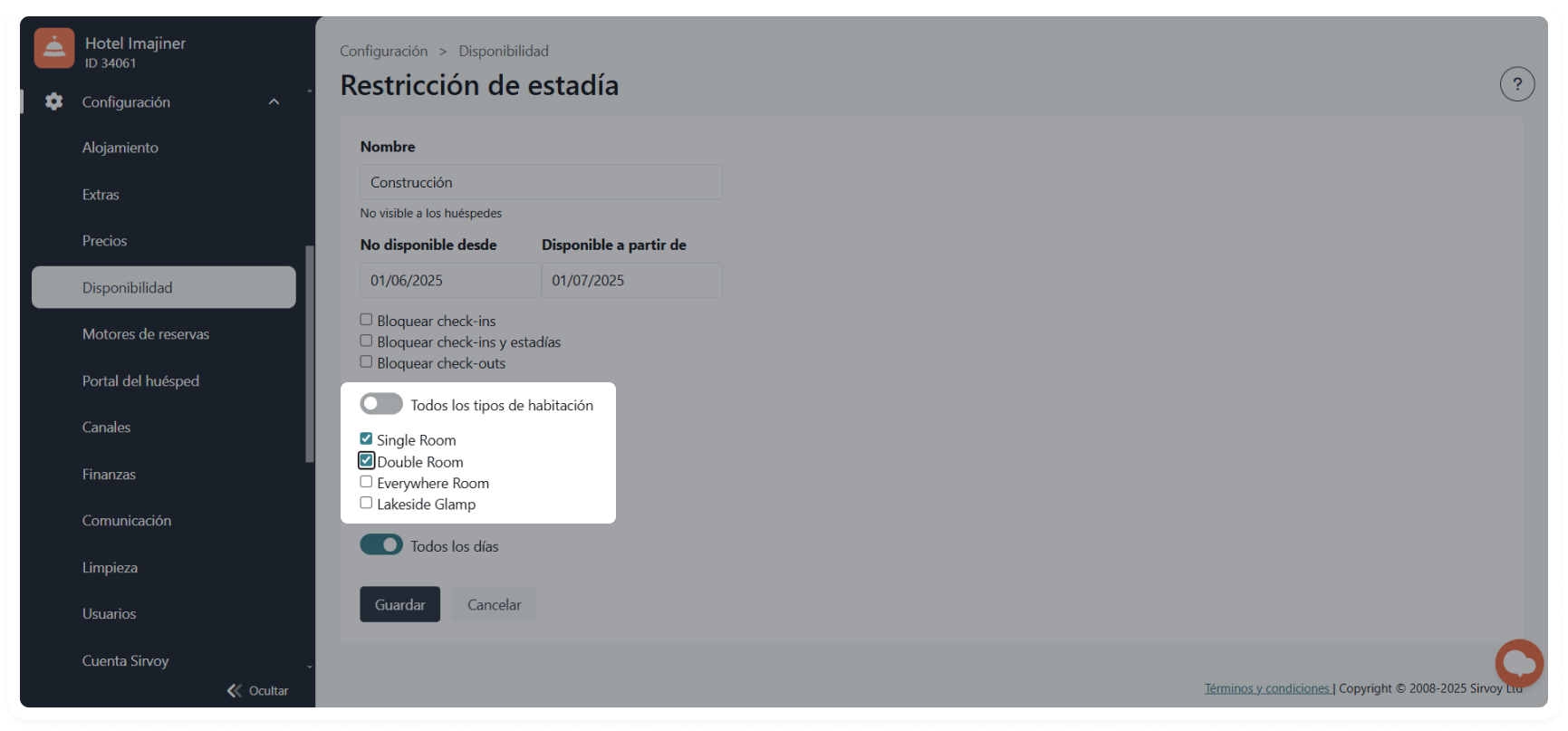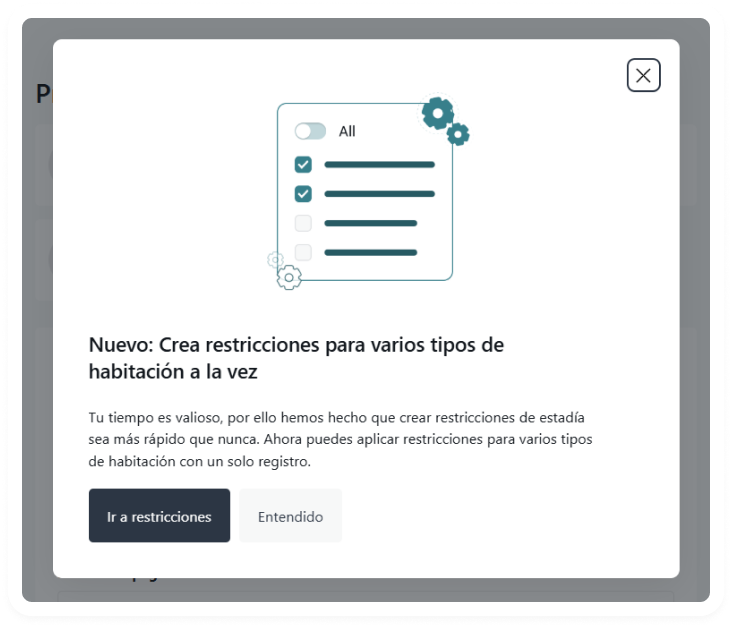 El manejo de las restricciones requería de muchos clics, pero ahora puedes seleccionar varios tipos de habitación a la vez y aplicar las restricciones en un solo paso, en lugar de necesitar una restricción individual para cada tipo de habitación. Es una forma más inteligente y rápida de gestionar las reglas según la temporada, los eventos o cualquier otra cosa que se te presente.