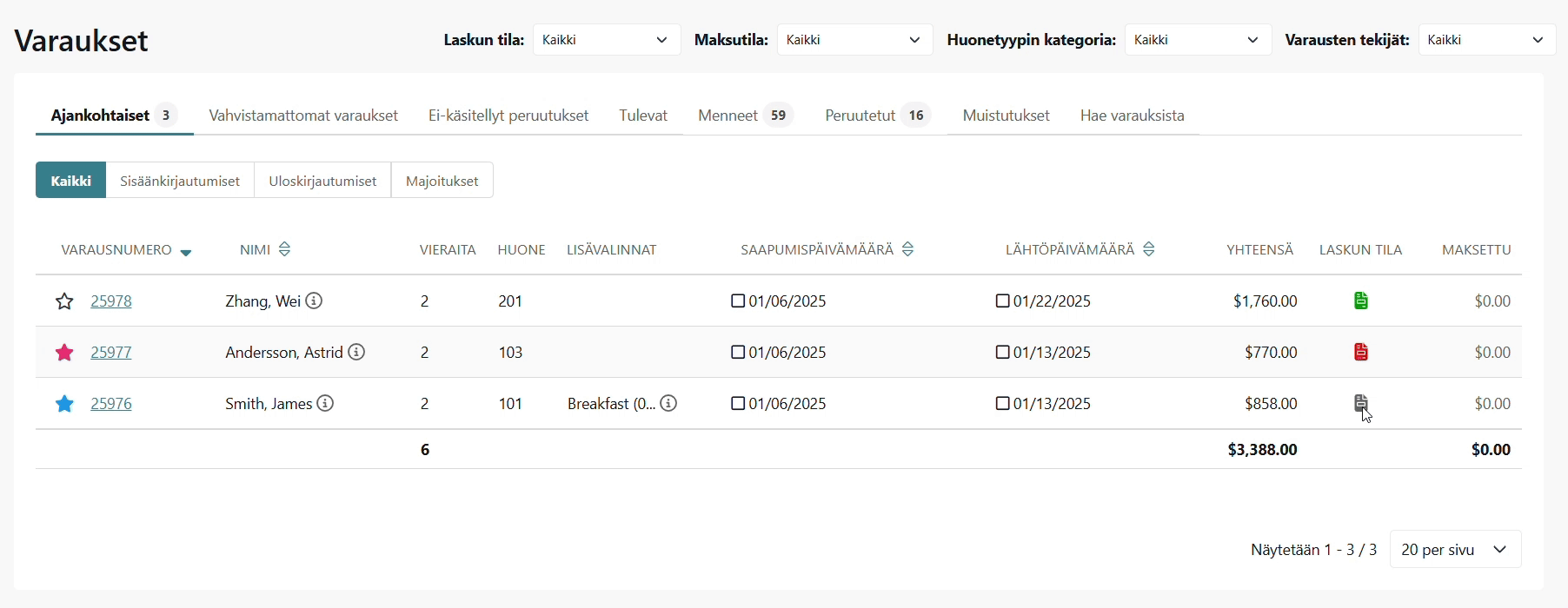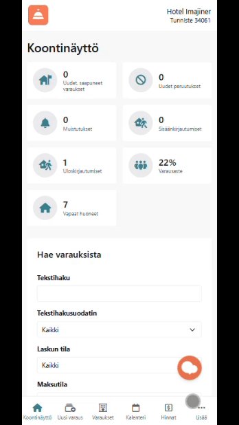 Majoituspalveluiden työnkulkuihin räätälöity mobiilinäkymä