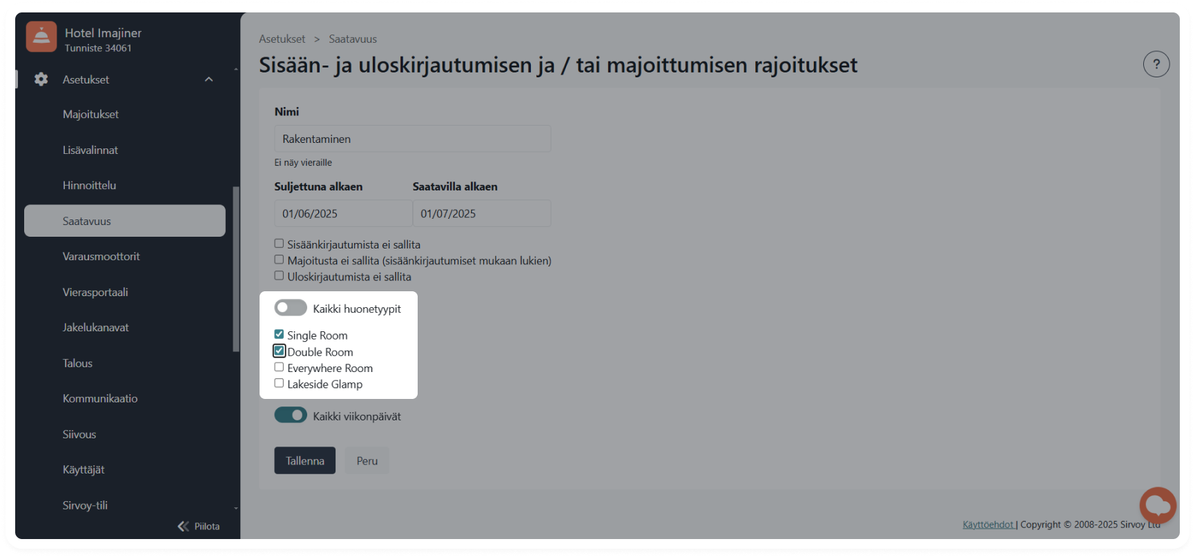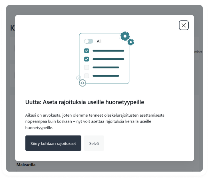 Rajoitusten hallinnointi on vaatinut paljon klikkauksia, mutta nyt voit valita useita huonetyyppejä kerralla ja ottaa rajoituksia käyttöön yhdessä vaiheessa, etkä enää tarvitse jokaiselle huonetyypille omaa rajoitusta. Se on älykkäämpi ja nopeampi tapa käsitellä sesonkisääntöjä, tapahtumia tai mitä tahansa muuta, mitä eteen tulee.