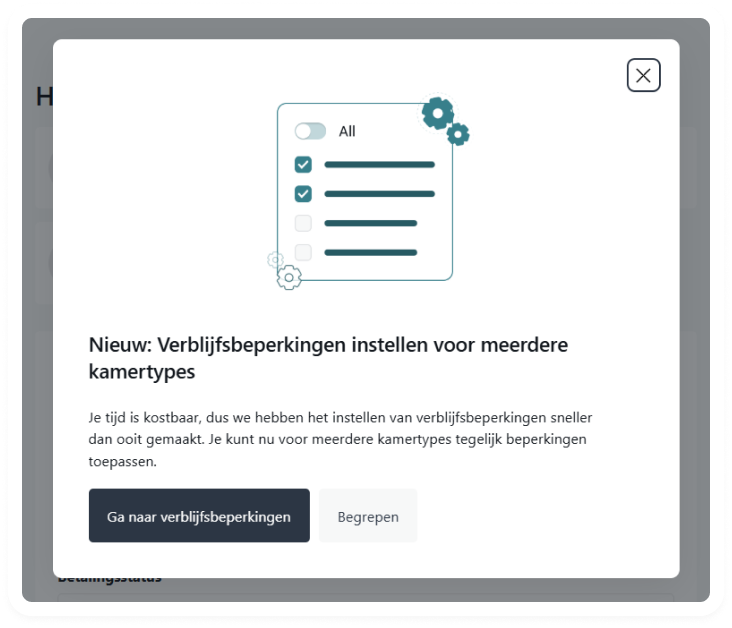Het beheren van beperkingen was klik-intensief, maar nu kun je meerdere kamertypes tegelijk selecteren en beperkingen in één stap toepassen in plaats van voor elk kamertype een individuele beperking aan te maken. Dit is een snellere en slimmere oplossing voor seizoensgebonden regels, evenementen of andere vereisten.